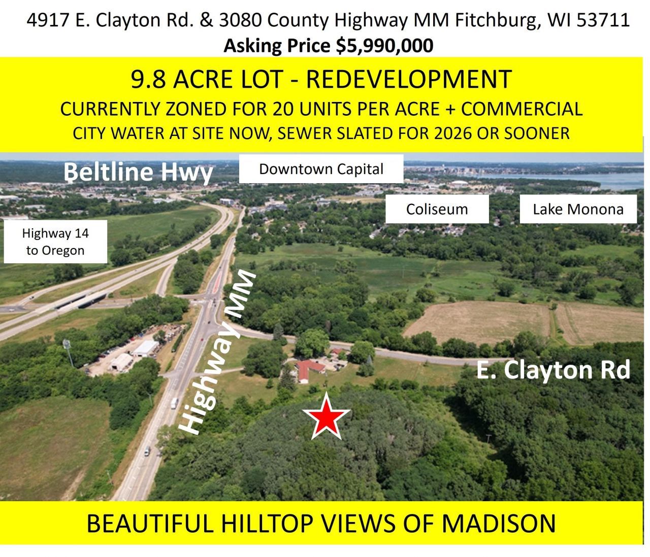 REDEVELOPMENT OPPORTUNITY - Prime location on the corner of Clayton Rd. & Highway MM in Fitchburg, WI. Priced at just $5,990,000, this 9.8-acre parcel offers endless potential for redevelopment. Situated on a beautiful hilltop, with breathtaking views of downtown Madison, Lake Monona, and the surrounding countryside, the property is just minutes away from the proposed development of the Dane County Coliseum and John Nolen Drive Lake Monona Waterfront Lake Development. City water is at the site with sewer slated for 2026 bringing the site ready for construction. Currently zoned at 20 units per acres along with commercial. Conveniently located just 4 miles from downtown Madison and with easy access to the Beltline Highway, this property offers both a quiet, secluded location and the convenience of urban living. 4917 E. Clayton Rd. is a 2,124 sq.ft. single family house which is currently leased out at $2,395/month until 4/30/2026. 3080 Highway MM is a 7-unit motel -short term rental.