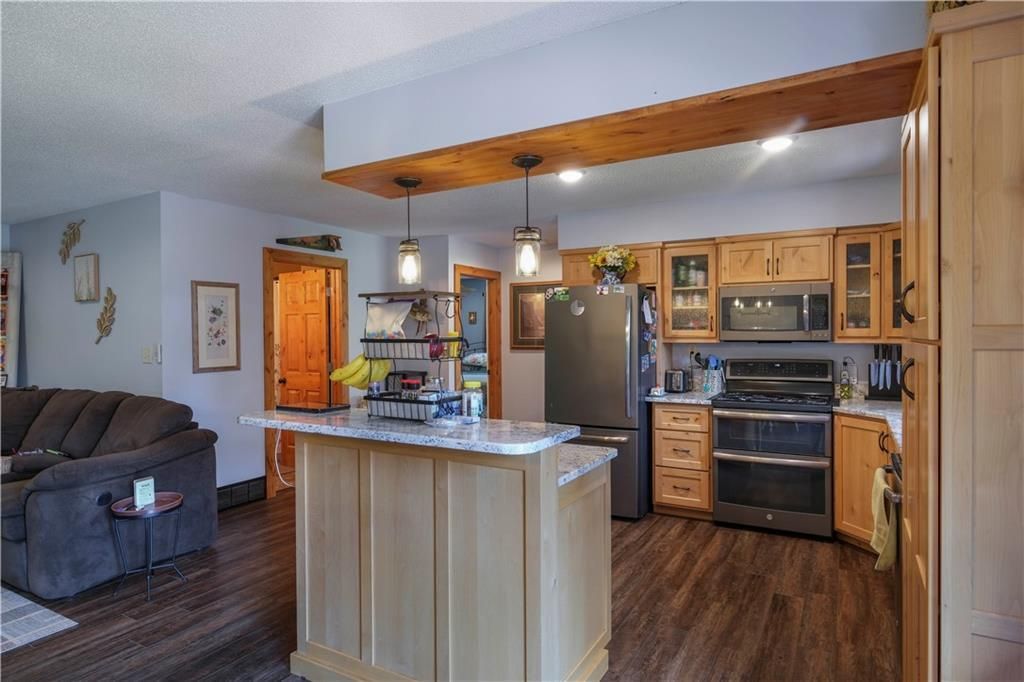 Welcome to this beautifully crafted 3-bed, 2-bath home offering 2,200 sq. ft. of comfortable living space, nestled in a peaceful setting with thoughtful features throughout. This home showcases Western LodgePole Pine siding and decking posts, giving it a warm, rustic character. Inside, enjoy durable LVP flooring, knotty alder cabinets, and granite countertops that blend style and functionality. A spacious 25x29 attached garage is fully insulated and heated ? perfect for year-round convenience. Additional storage and workspace abound with a generous 2,560 sq. ft. pole building. Step outside to your private retreat: a paver patio with fire pit, a well-kept yard filled with fruit trees and perennials, and a charming covered bridge entrance that welcomes guests with unique curb appeal. The lower level offers a walk-out for easy backyard access and extra living or entertaining space. Modern comforts include forced air with A/C (Ruud) and baseboard electric heat on the lower level.